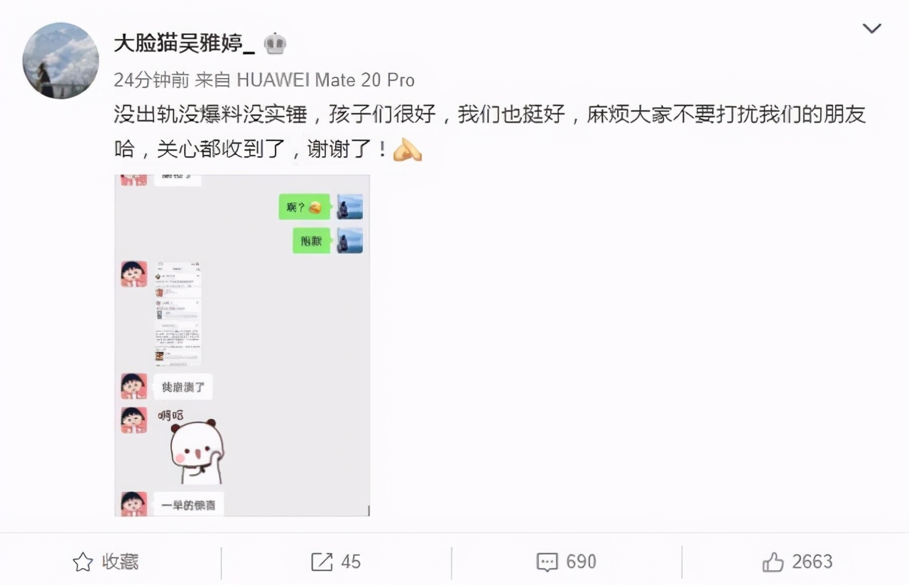 沒有出軌、沒有爆料、沒有實錘。我們都很好,孩子也很好,希望不要打擾我們的朋友。