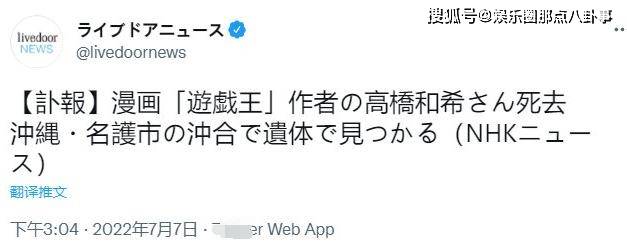 NHK稱,有人6日在沖繩縣名護市近海海面上發現一具身上穿戴著浮潛用具的尸體,當地海上保安署7日核實確認死者系日本漫畫家高橋和希,目前當地海上保安署及警方正在對其死亡原因進行調查。