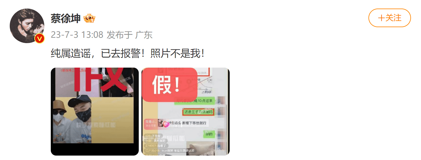 7月3日中午,蔡徐坤再度發(fā)博回應(yīng):純屬造謠,已去報(bào)警!照片不是我