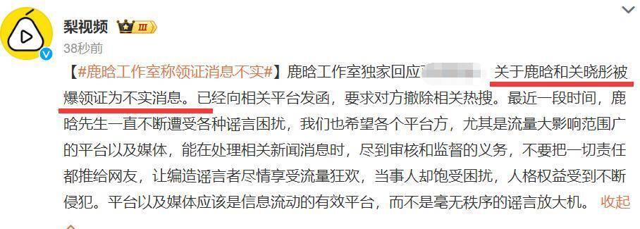 然而正當大家熱議中,鹿晗方發(fā)聲回應了,鹿晗工作室回應說,關于鹿晗和關曉彤領證是不實消息,已向相關平臺發(fā)函,要求對方刪除相關熱搜,還說鹿晗最近一段時間不斷遭受各種謠言,希望各個平臺方,尤其是流量大的影響廣的平臺以及媒體能在處理相關新聞消息時,盡量審核和監(jiān)督的義務,不要把一切責任推給網友,讓編造謠言者盡情享受流量狂歡,當事人卻飽受困擾。