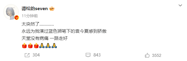 出演《錦衣之下》電視劇女主角袁今夏的演員譚松韻發文悼念,譚松韻寫道:“太突然了……永遠為我演過藍色獅筆下的袁今夏感到驕傲,天堂沒有病痛,一路走好。”