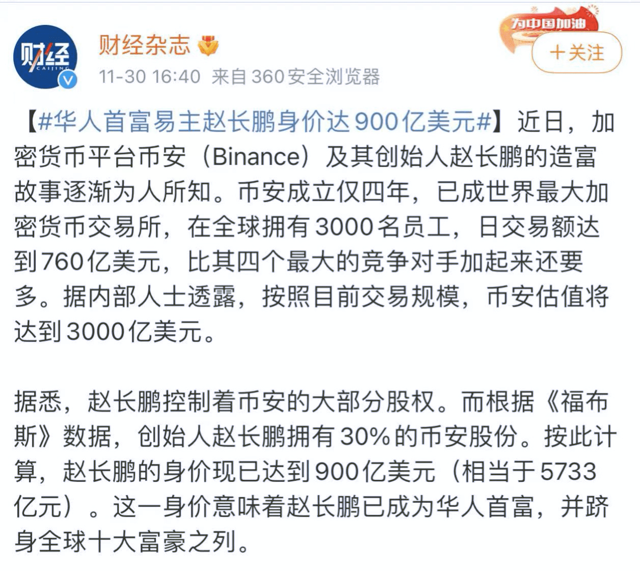 但不到一個月后的11月30日下午,《財經》發布微博稱華人首富易主,44歲的趙長鵬憑借900億美元(相當于5733億元人民幣)的身價超過農夫山泉董事長鐘睒睒,并躋身全球十大富豪之列。