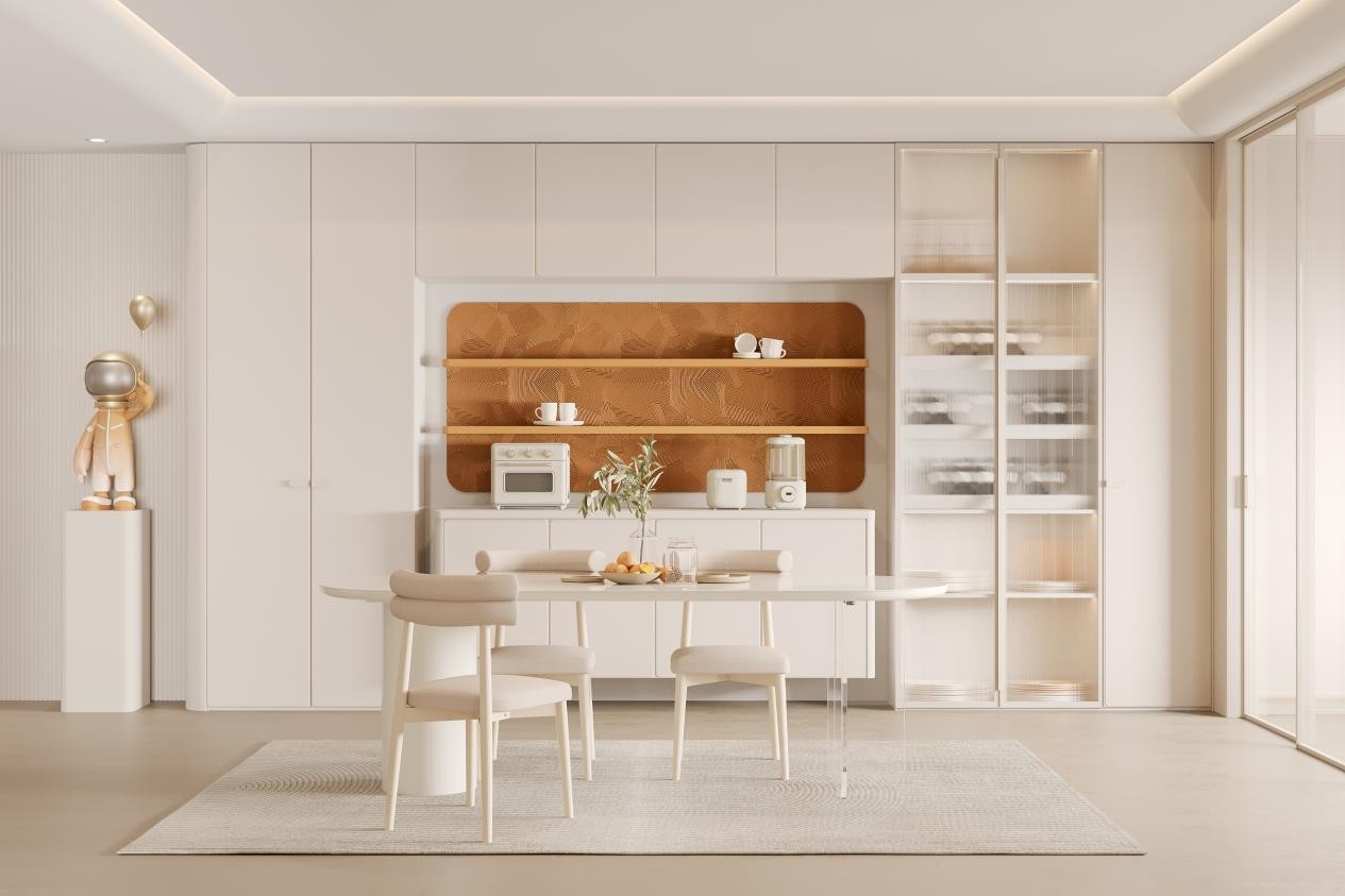 餐廳科學布局,焦糖色背板搭配慕斯白懸掛柜體,打造開放式操作臺,擴充空間。長虹玻璃柜門+內嵌燈帶,流露出若隱若現的朦朧美感,美酒被盡數藏納,美觀實用。奶油風配色餐桌椅的選用,讓整體效果更加柔和,桌椅邊角自然圓潤,空間更具有親和力。