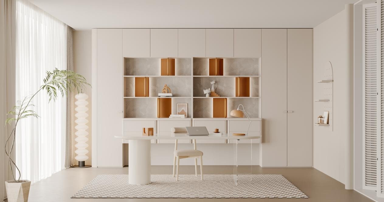 本次新品還采用了浮雕裝飾板為柜體增添新意,慕斯白、焦糖橙做底色,浮雕紋理仿佛奶油蛋糕上的雕花,層次豐富。多變的組合展示柜,可以滿足藏品、潮玩手辦、書籍的展示需求,線性開放格造型靈動,豐富了視覺效果。