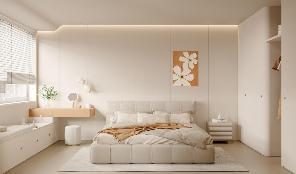臥室用奶油色護墻板裝飾,搭配靈動燈帶,打造出“又甜又奶”的元氣空間,溫馨且治愈,陽光漫入時,還給人一種懶洋洋的松弛感。飄窗柜、梳妝臺一體連接,整體融合美觀,拓展出臥室的更多可能性。
