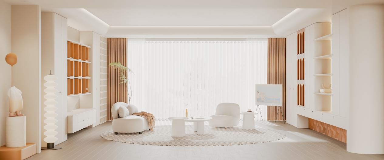 想要裝出治愈感滿滿的奶油風,需要注意顏色、線條的與家具的搭配。設計師以現代的設計手法,從心靈感受出發,用奶油般的材質潤化空間的疏離感,讓空間呈現出被細膩奶油包裹的溫柔氛圍。