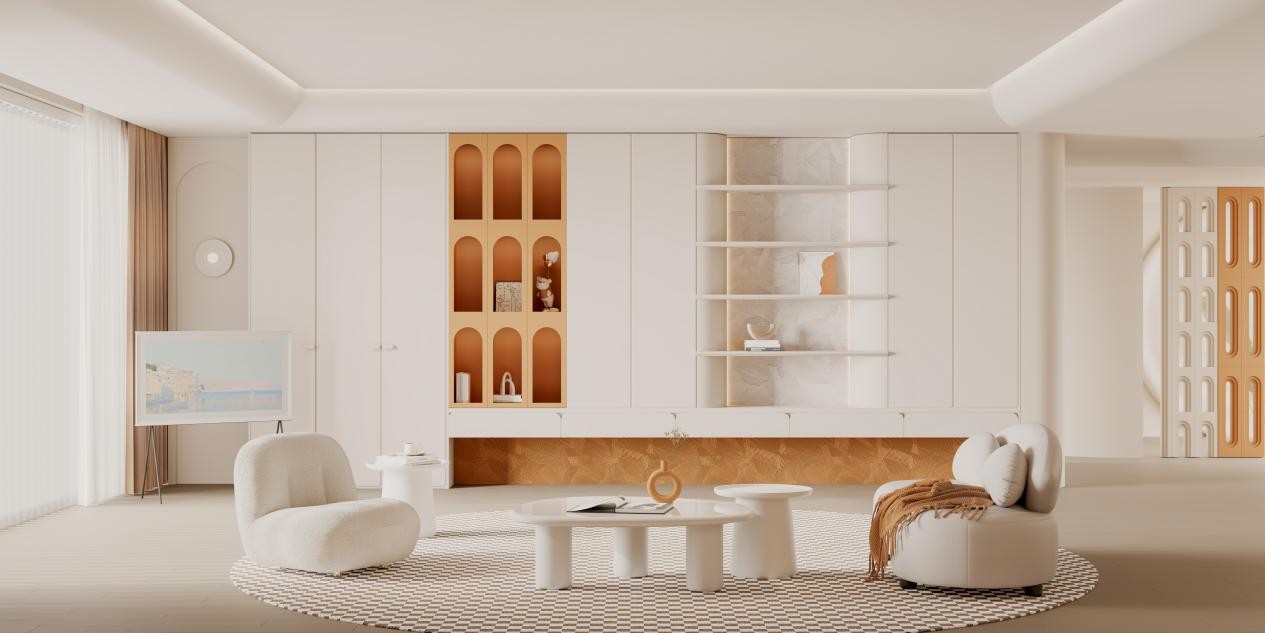 柜體設計要注意輪廓的柔和性。客廳定制集展示與收納功能于一體的滿墻柜體,弧線穿插其中,打造連續性視覺。抽面、封板、造型邊角都設計為倒圓線條,給人以渾然天成的柔和感。圓拱式裝飾板有序重復,打破單一背景墻模式,讓生活充滿藝術氣息。