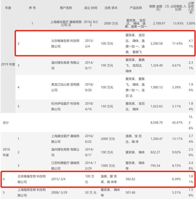 譬如“北京唯康生物”,作為愛美客連續前五大經銷商,公司交社保的人數居然才2個人。
