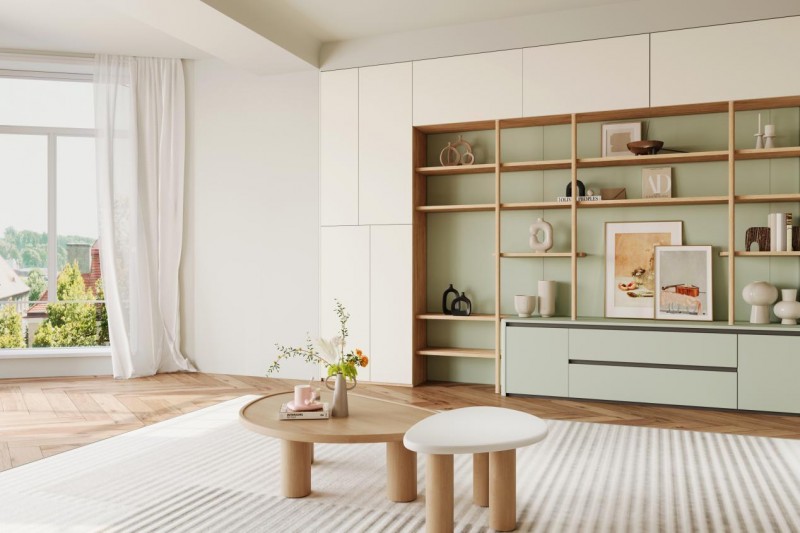 開放格層+裝飾圓柱設計,金屬內柱承托力強,不易受潮變形,木皮包覆內柱,整體風格和諧統一,治愈清新。開放格給空間帶來通透視角,擺放手辦、綠植、書籍等物品,所愛之物盡收眼底,拿取便利。