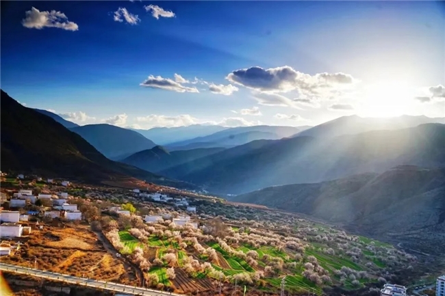得榮的暮春正榮赴一場浪漫的春日花事,十里桃花灼灼開放,蔓野迎春,雪山隱隱旖旎而來,一片美景良辰,構成一幅高原春景圖。