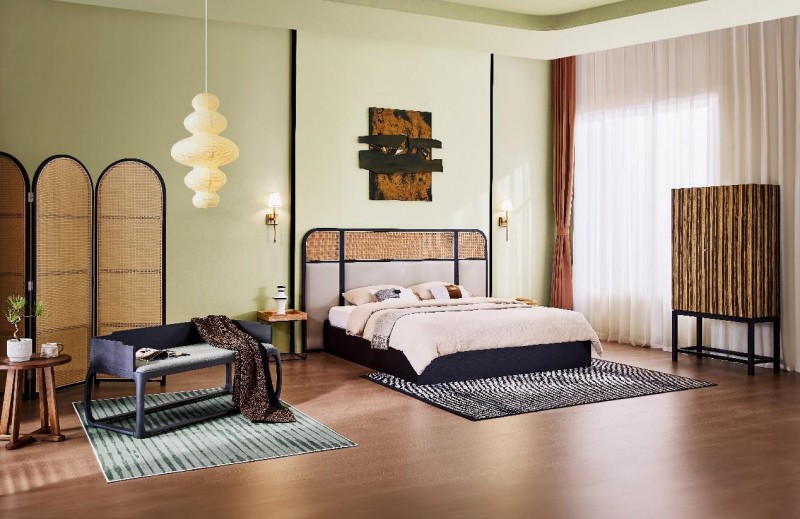 步入臥室,打開透著日光的竹編屏風,羅漢椅、軟床、裝飾柜依次出現,傳遞出超越時空的美感。