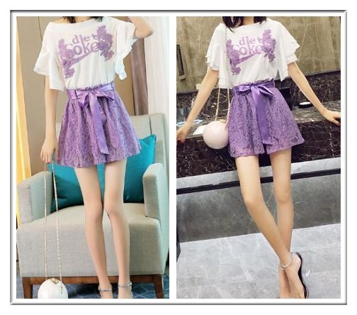 超顯高的夏季搭配,白色喇叭袖上衣搭配紫色蕾絲短褲,上衣的印花顏色和褲子的顏色相對應,相當優雅迷人的顏色,蕾絲短褲有著系帶蝴蝶結裝飾,少女感十足,蕾絲的面料輕盈飄逸,將腿部的線條都拉長了,滿屏都是大長腿的視覺感。