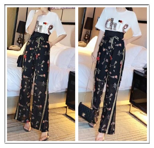 搭配八:圓領印花t恤+碎花高腰闊腿褲