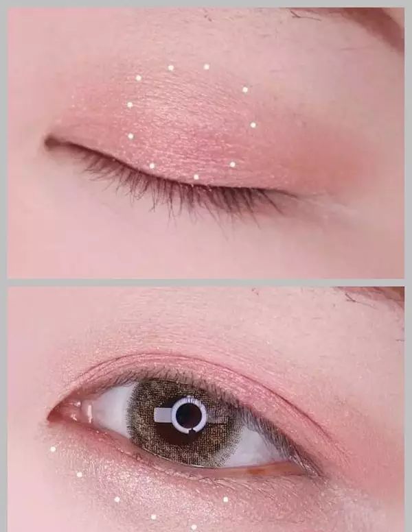 先在眼皮中部涂上玫粉色眼影,再在下眼瞼處涂上玫瑰金色眼影,點亮眼部。