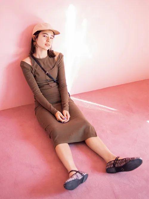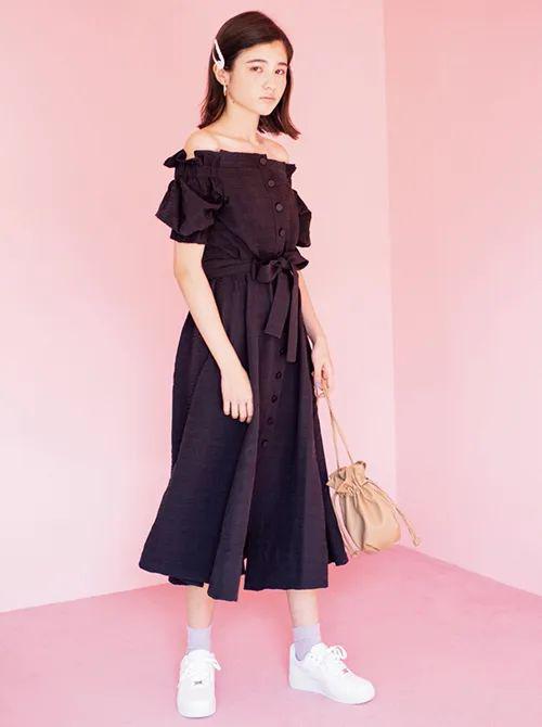 花邊褶皺一字領的黑色連衣裙,足部搭配運動鞋,不會過于顯GIRLY風,剛剛好的甜美度!