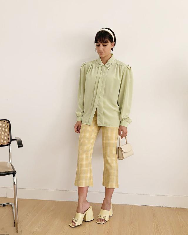 奶酪色的短褲同樣可以搭配綠色的襯衫,上身穿一件寬松舒適的買綠色低領襯衫,下身搭配一條奶酪色格子七分微喇褲。再拎上一只白色小方包,上長下短的搭配時髦感十足