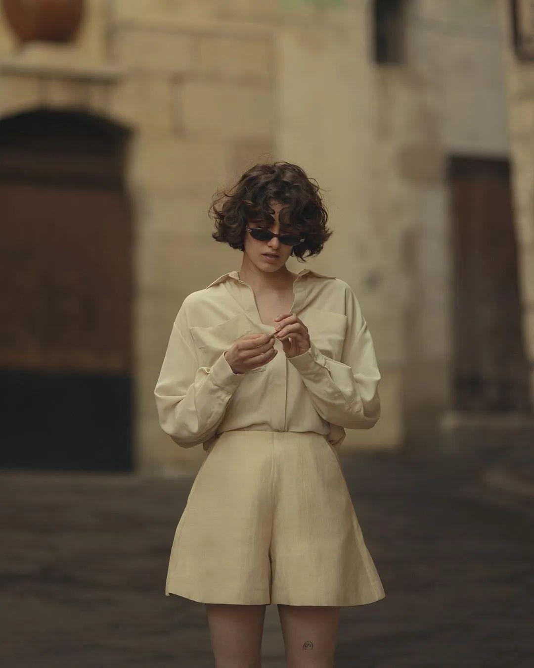 A字短褲除了常規款式以外,著重強調高腰系帶的紙袋褲設計也比較常見。紙袋褲自帶文藝干凈的氣質,所以非常建議大家 優先選擇清淺色系或日系卡其褲里常見的色系,比如白色、卡其棕、淺駝等。