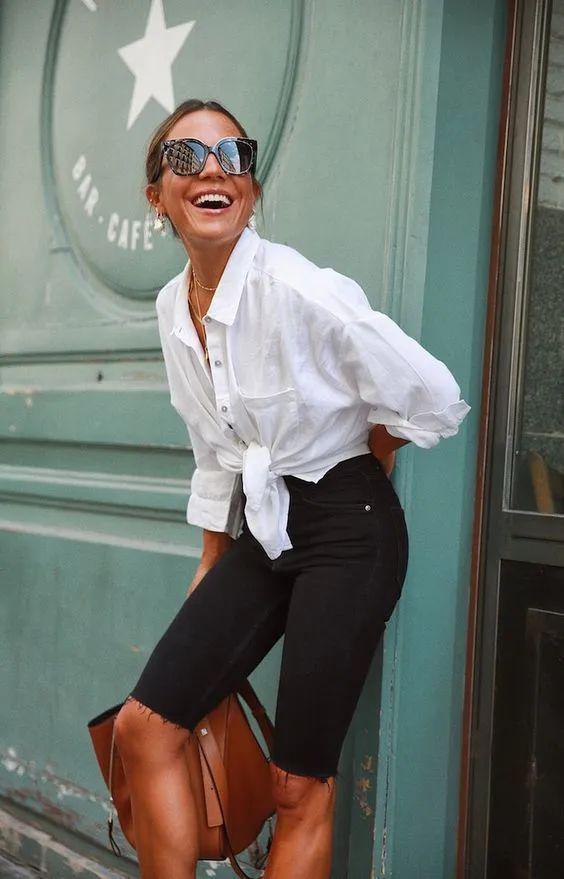 A字短褲一直是多年來的經典款,她對于東方女性的胯部、臀圍有最友好的修飾效果。 這樣的短褲依然流行,而且在穿搭上多了一些驚喜。今年非常流行“上重下輕”的方式來搭配A字短褲,尤其是 大量感甜系襯衫+A字短褲。
