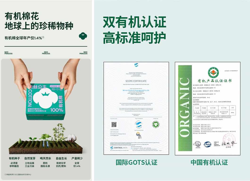 僅占全球棉花產量1.4%,有機棉的自然、珍貴正契合人們對于健康的追求。為給所有女生帶來更高階的使用體驗,全棉時代在原有全棉面層的基礎上,升級使用100%有機棉,面層通過中國與國際GOTS雙有機認證,給安心雙重保障。