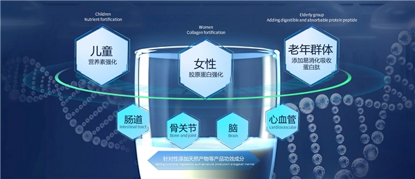 “針對老年群體添加易消化吸收蛋白肽;針對女性進行膠原蛋白強化;針對兒童發育進行營養素強化;針對心血管、腸道、骨關節、腦等特定健康需求,具體添加天然產物等食品功效成分……”