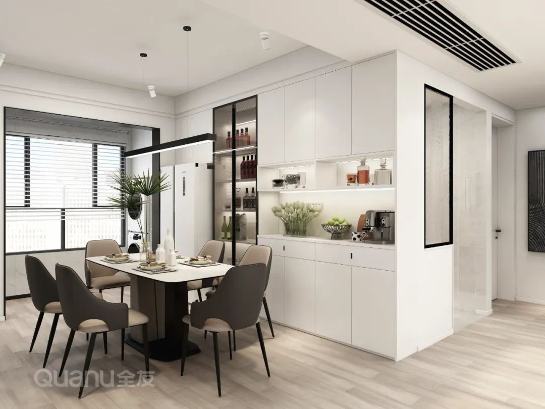 餐廳定制整墻餐邊柜,白色門板+免拉手簡約大氣,中空位內嵌燈帶,營造出更靈動的氛圍感。最左側預留空位內嵌冰箱,提升空間利用率。
