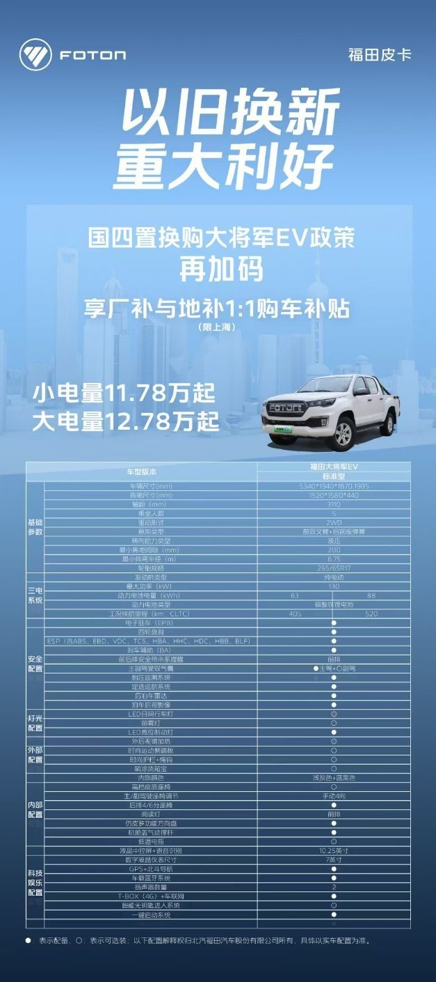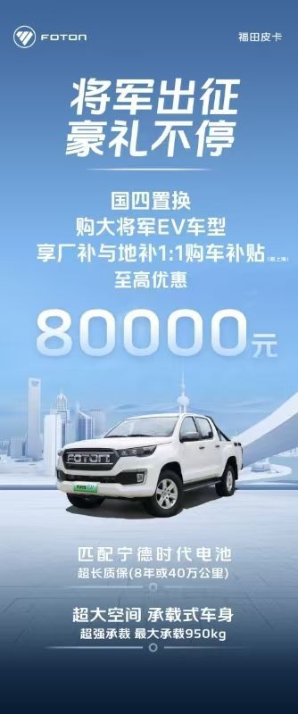 上海市推出的此次補(bǔ)貼活動(dòng),將持續(xù)到2027年3月31日。與此同時(shí),作為國(guó)內(nèi)新能源皮卡市場(chǎng)的佼佼者,福田大將軍EV也針對(duì)旗下部分車型,推出了至高優(yōu)惠8萬(wàn)元的置換補(bǔ)貼。福田大將軍EV以其卓越的產(chǎn)品性能、完善的售后服務(wù)以及積極響應(yīng)政策的姿態(tài),無(wú)疑成為了消費(fèi)者擁抱綠色出行的理想選擇。