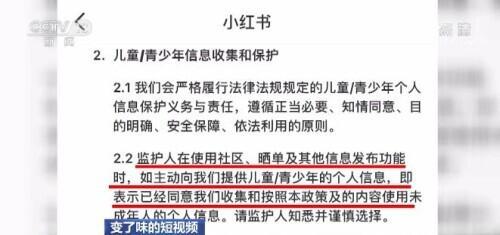 “小紅書”工作人員表示由于短視頻數量多,造成了審核的漏洞。而記者發現,在“小紅書”APP的用戶協議中特別指出“重視青少年兒童的個人信息保護”,但在其《兒童青少年個人信息保護規則》協議中卻注明“監護人在使用社區、曬單及其他信息發布功能時,如主動向我們提供兒童青少年的個人信息,即表示已經同意我們收集和按照本政策的內容使用未成年人的個人信息。”