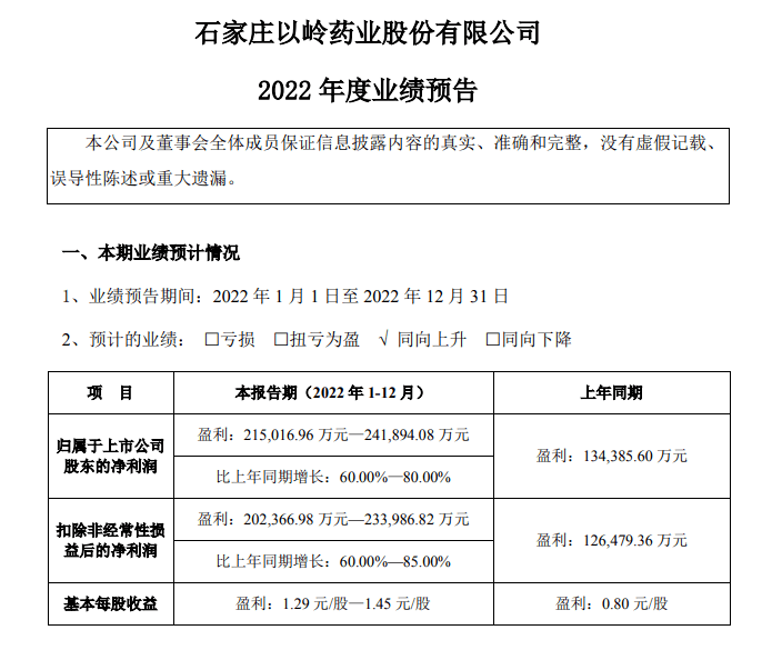 近日,石家莊以嶺藥業股份有限公司發布業績預告,預計2022年凈利潤為21.5億元-24.18億元,同比增長60%到80%,上年同期為13.44億元。