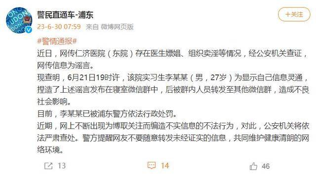 實(shí)習(xí)生造謠仁濟(jì)醫(yī)院組織賣淫被罰 網(wǎng)絡(luò)不是法外之地!