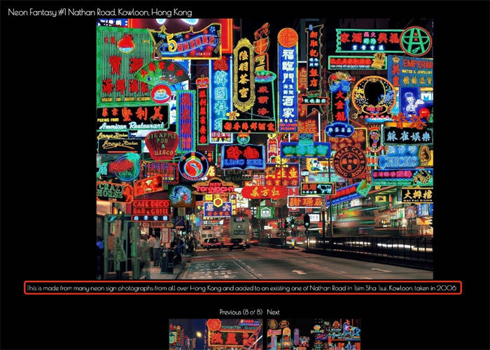 據(jù)Keith MacGregor個人網(wǎng)站介紹,這幅作品是將香港各地的多張霓虹招牌照片拼接后制作而成,并加入了九龍尖沙咀彌敦道的照片,并非單個的真實場景。