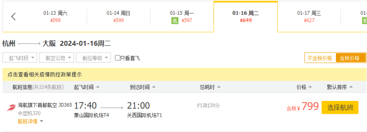 同樣的情況發生在杭州飛大阪線上。1月16日,杭州直飛大阪的機票含稅799元,1月17日杭州直飛大阪機票773元,而如果選擇轉機,價格更便宜,1月19日杭州飛大阪(經廈門中轉)含稅627元,類似的低價將持續到1月31日。
