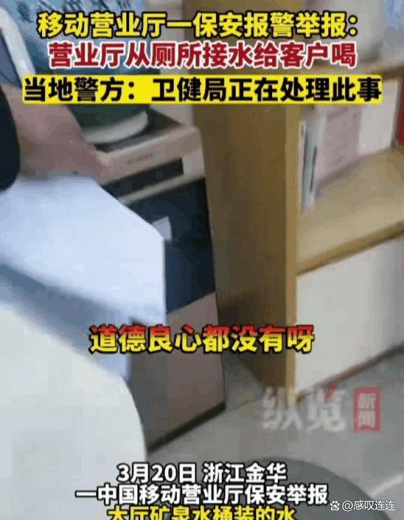 近日,一則涉及浙江金華某中國移動營業廳的新聞在網絡上引發了公眾強烈的反響。據燕趙都市報3月21日報道,3月20日,有網友發布視頻揭露,該移動營業廳竟然將廁所內的自來水未經任何處理直接灌入礦泉水桶內供客戶飲用,這一行為令人震驚不已。