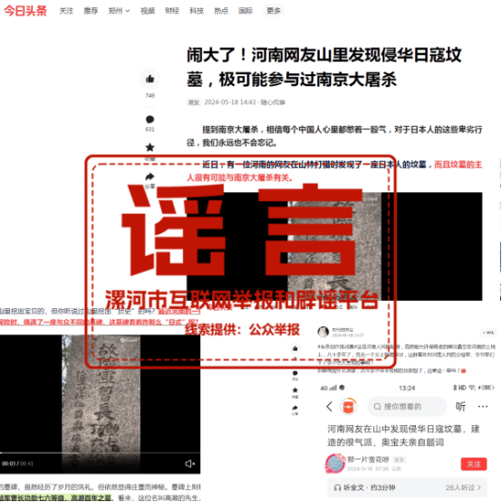 據微信公眾號“漯河網信”19日消息,河南漯河市互聯網違法和不良信息舉報中心對“河南網友在山中發現侵華日寇墳墓”進行辟謠:
