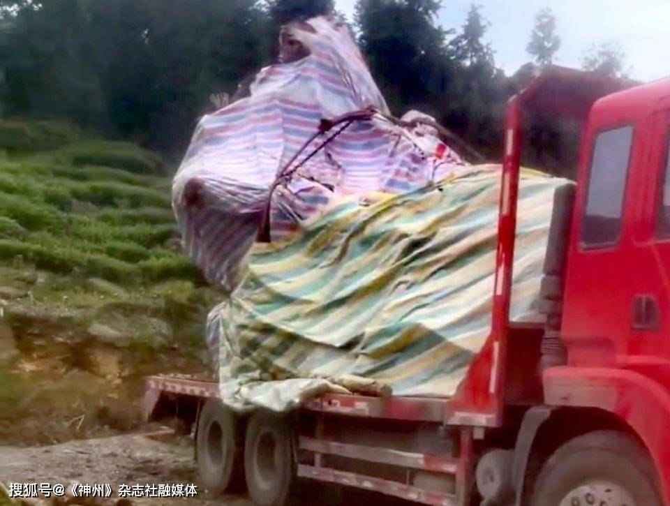 網友拍攝的視頻顯示,一輛紅色大貨車上裝著一個“龐然大物”,并遮蓋彩條布。另一段視頻顯示,在警車開道下,該大貨車沿著山路緩緩行駛。