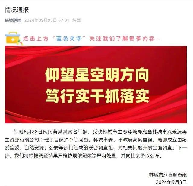 9月3日,韓城市聯合調查組發布情況通報:針對8月28日網民黃某某實名舉報,反映韓城市生態環境局充當韓城市興禾源再生資源有限公司治理項目保護傘等問題,韓城市委、市政府高度重視,隨即成立由紀委監委、自然資源、公安等部門組成的聯合調查組,對相關問題開展全面調查。下一步,我們將根據調查結果嚴格依規依紀依法嚴肅處置,并向社會予以公布。