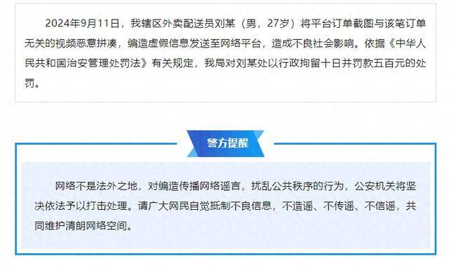 9月12日,據瀍河公安:2024年9月11日,我轄區外賣配送員劉某(男,27歲)將平臺訂單截圖與該筆訂單無關的視頻惡意拼湊,編造虛假信息發送至網絡平臺,造成不良社會影響。依據《中華人民共和國治安管理處罰法》有關規定,我局對劉某處以行政拘留十日并罰款五百元的處罰。
