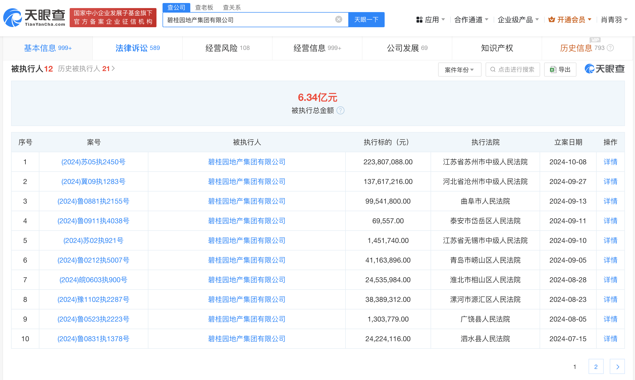 風險信息顯示,碧桂園地產集團有限公司現存12條被執行人信息,被執行總金額超6.3億元。此外,該公司還存在多條限制消費令、失信被執行人(老賴)及股權凍結信息。