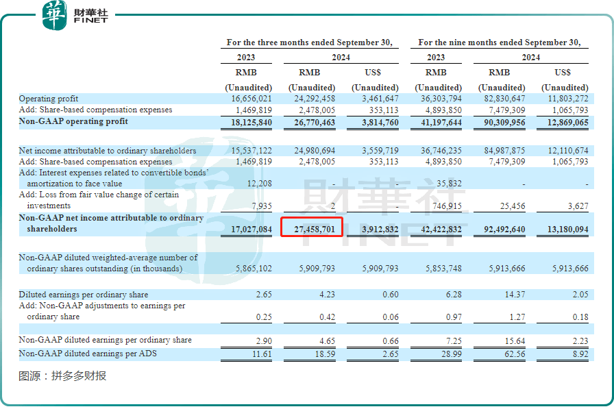 另外,第三季度,拼多多的歸母凈利潤為249.81億元,同比增長61%;Non-GAAP準則下,歸母凈利潤為274.59億元,同比增長61%。
