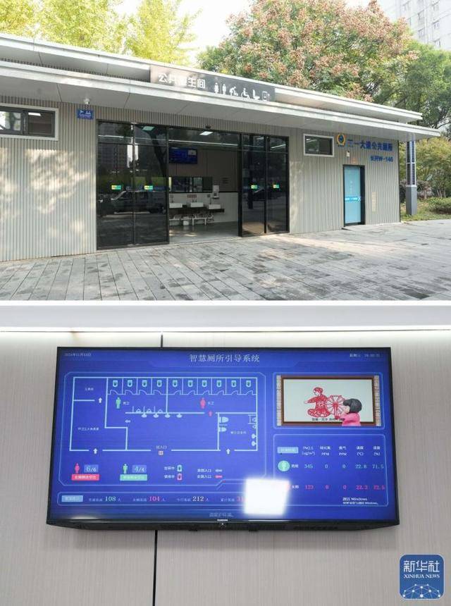 上圖為長(zhǎng)沙市三一大道公共衛(wèi)生間;下圖為三一大道公共衛(wèi)生間內(nèi)設(shè)置的智慧廁所引導(dǎo)系統(tǒng)(11月13日攝,拼版照片)。這個(gè)公共衛(wèi)生間提高了女性廁位比例,衛(wèi)生間內(nèi)設(shè)置的智慧廁所引導(dǎo)系統(tǒng)能顯示衛(wèi)生間內(nèi)的繁忙程度。