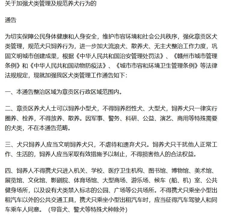 譚敏濤補(bǔ)充,根據(jù)贛州市公安局章貢分局、贛州市章貢區(qū)城管局發(fā)布的《關(guān)于加強(qiáng)犬類管理及規(guī)范養(yǎng)犬行為的通告》,章貢區(qū)養(yǎng)犬人士可以飼養(yǎng)小型犬,不得飼養(yǎng)烈性犬、大型犬,飼養(yǎng)犬只一律實(shí)行圈養(yǎng)、拴繩,不得放養(yǎng)、散養(yǎng)。