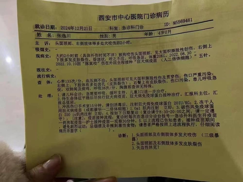 “最后我們到西安市兒童醫(yī)院才把娃收下來,因為打的那個狂犬疫苗只有中心醫(yī)院有,然后從中心醫(yī)院叫的醫(yī)生護士過去,晚上八點多開始做手術(shù),手續(xù)一直持續(xù)到早晨六點。”張父說。