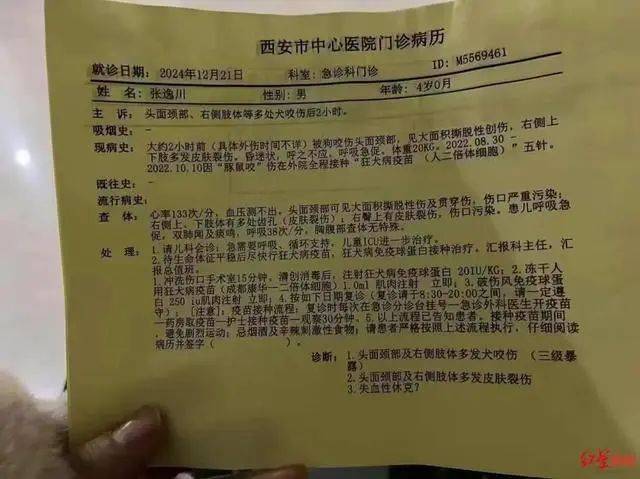 張父提供了張逸川的門診病歷,顯示其“被狗咬傷頭面頸部,見大面積撕脫性創(chuàng)傷,右側上下肢多發(fā)皮膚裂傷;杳誀睿糁粦,呼吸急促”。