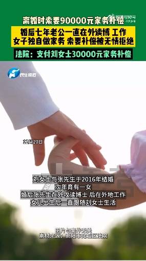 近日,河南南陽。劉女士(化名)結(jié)婚后,丈夫張先生(化名)一直在外地攻讀博士,她獨自一人撫養(yǎng)女兒。婚后7年二人因長期分居感情破裂,劉女士提出離婚,要求丈夫支付家務(wù)補償90000元。