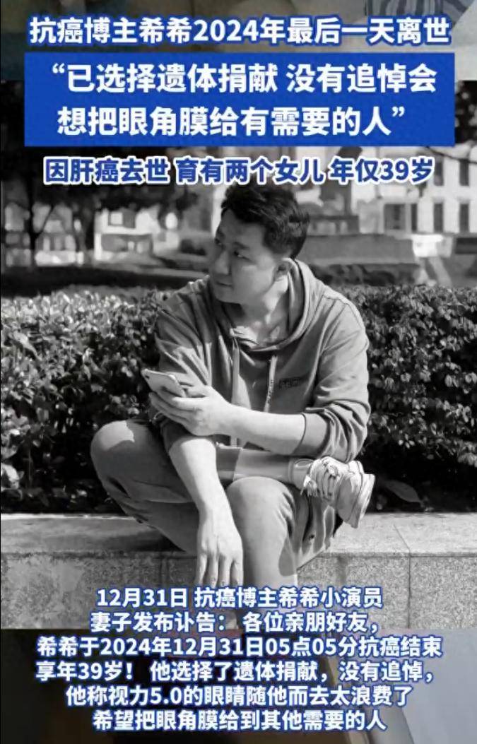 2024年12月31日,抗癌博主“希希小演員”妻子發布訃告:各位親朋好友,希希于2024年12月31日05點05分抗癌結束,享年39歲,他選擇了遺體捐獻,沒有追悼會,他稱視力5.0的眼睛隨他而去太浪費了,希望把眼角膜給到其他需要的人。