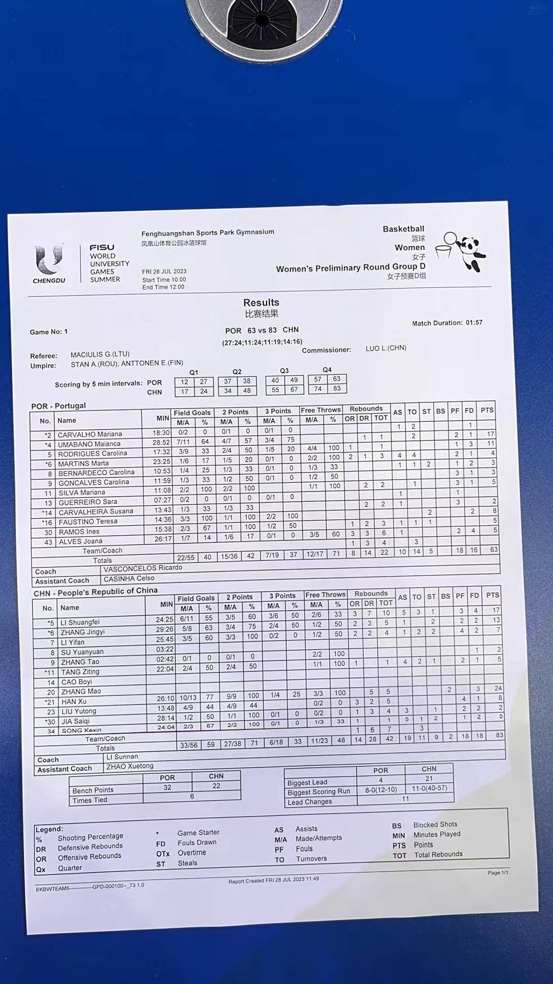 7月28日10時,中國女籃迎來成都大運會首戰,對手為葡萄牙隊。