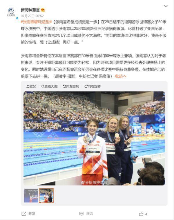 據(jù)中國新聞社@新聞種草官報道,在女子50米蝶泳決賽中,張雨霏摘得銀牌盡管打破了亞洲紀(jì)錄,但張雨霏在賽后直言對幾個項目成績?nèi)圆惶珴M意。“同組的覃海洋比得非常好,我是不服輸?shù)男愿瘢耄ㄗ尦煽儯┰俸靡稽c。”
