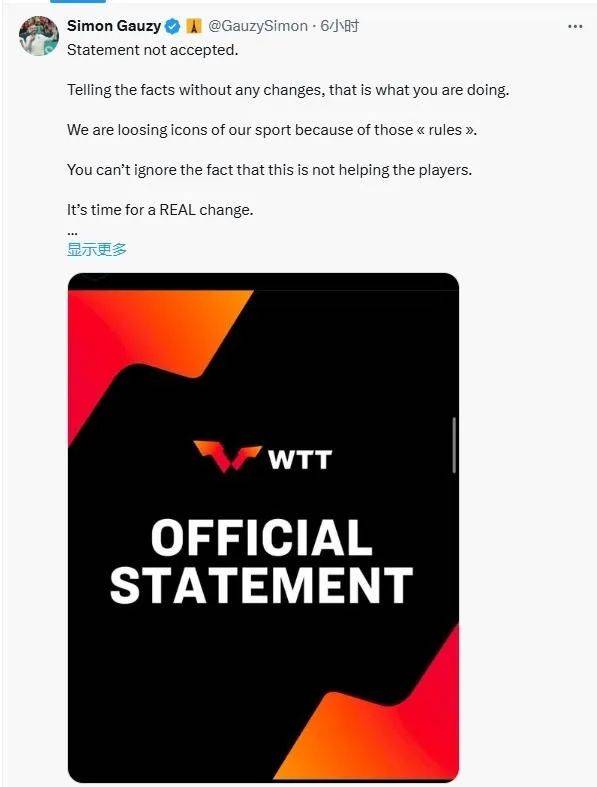 12月29日,法國乒乓球運(yùn)動(dòng)員多人發(fā)聲,西蒙·高茨在個(gè)人社媒寫道:“不接受聲明。不加任何改變地陳述事實(shí),這就是你正在做的事情。因?yàn)檫@些規(guī)則,我們正在失去這項(xiàng)運(yùn)動(dòng)的偶像。你不能忽視這對(duì)球員沒有幫助的事實(shí)。現(xiàn)在是進(jìn)行真正改變的時(shí)候了。”