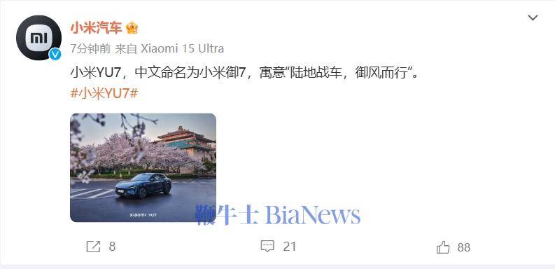 雷軍宣布小米YU7正式中文名:小米御7,寓意御風而行