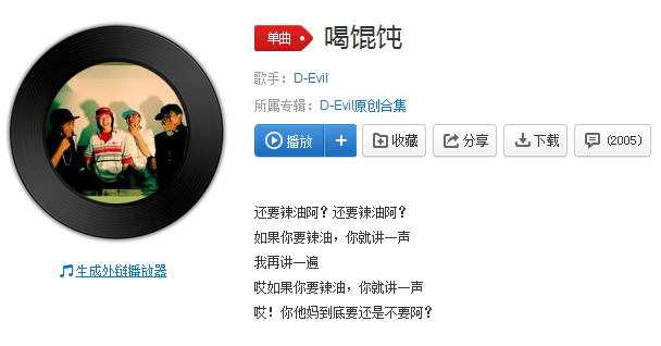 D-Evil南京饒舌團體的歌曲《喝餛飩》。最近抖音上一首“啊要辣油啊 啊要辣油啊”的方言說唱很火,歌曲名字是《喝餛飩》。不少人聽完表示想立馬飛到南京來一碗混沌,而且還是要辣油的那種。