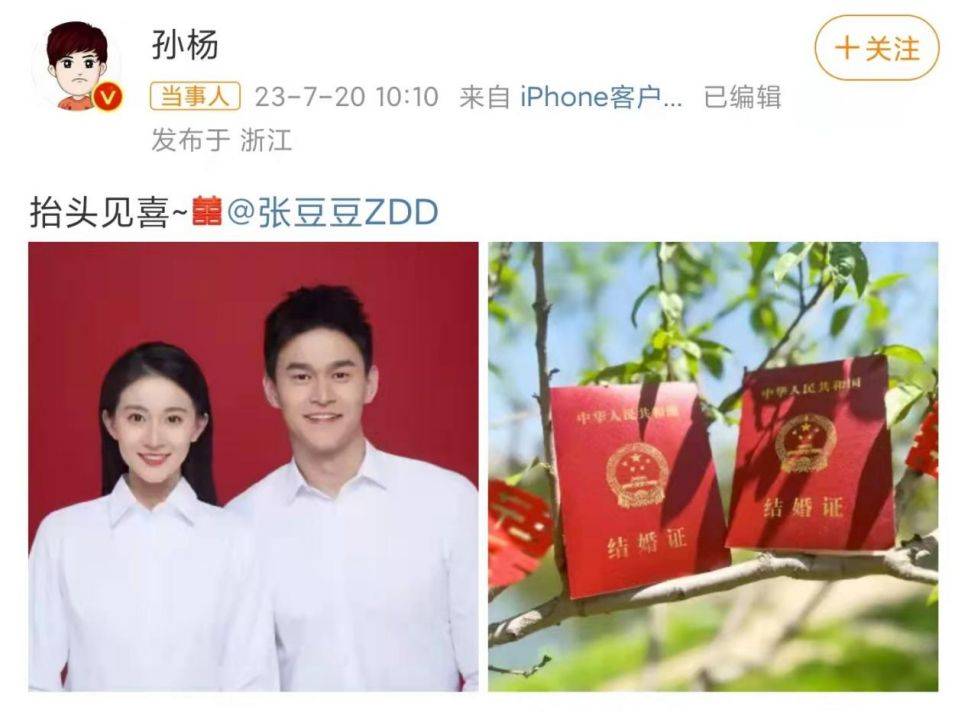20日,孫楊曬出結(jié)婚證與結(jié)婚照,官宣與張豆豆結(jié)婚。